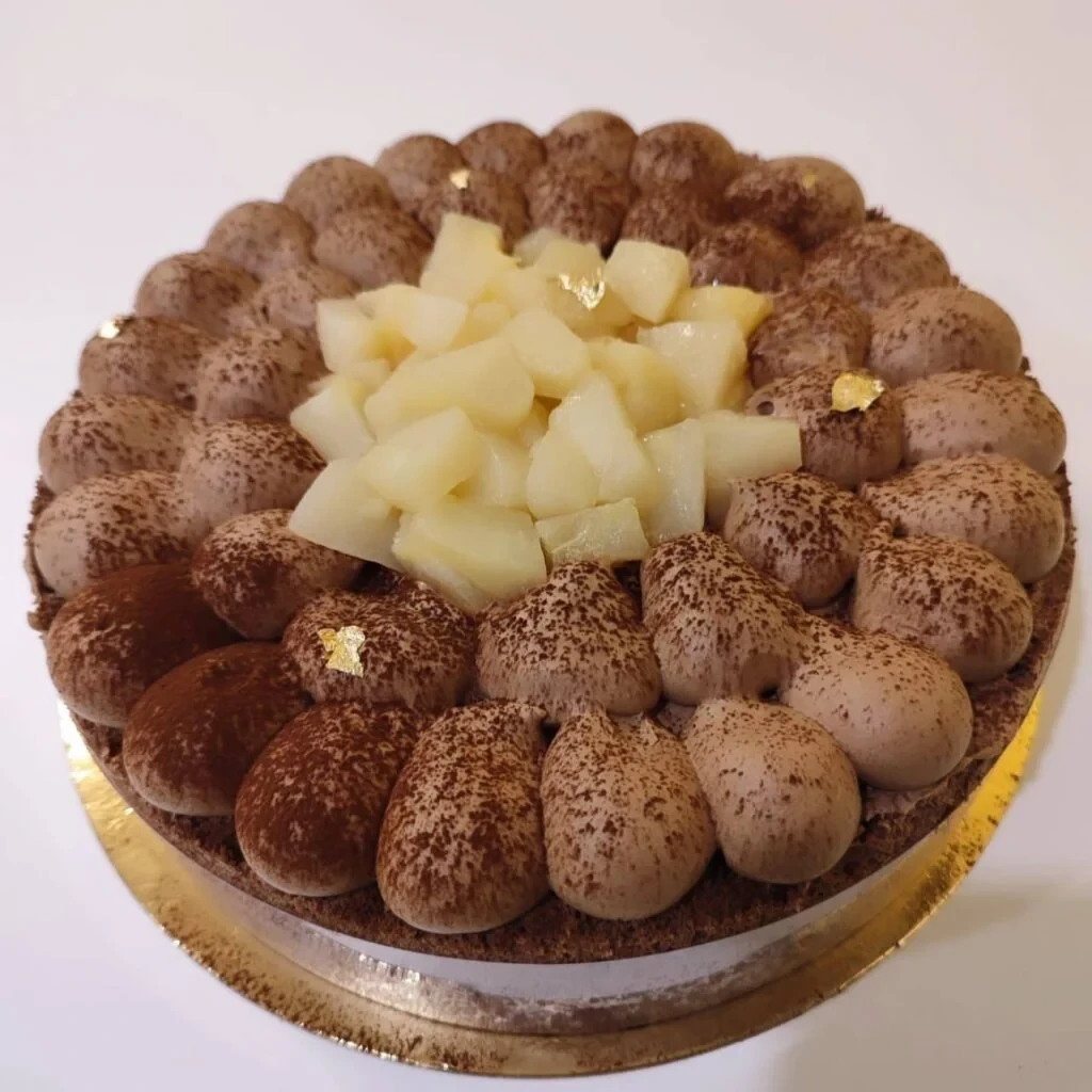 Biscuit cacao, mousse légère au chocolat, poires caramélisées.